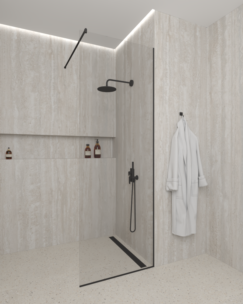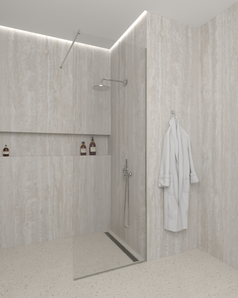 Dušo sienelė be rėmų iš itin saugaus grūdinto 6 mm storio stiklo. Gaminiai, kurių dydis virš 110cm gaminami iš 8mm stiklo. Ši dušo sienelė puikiai įsikomponuoja minimalistiniame vonios kambario interjere. Stiklas padengto danga "greiti lašai". Galimi ir nestandartiniai matmenys. Sienelės aukštis 2000 mm.